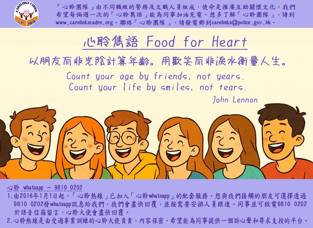《心聆雋語》以朋友而非光陰計算年齡。以歡笑而非淚水衡量人生。 2026 年 02 月 20 日2026 年 02 月 24 日 以朋友而非光陰計算年齡。以歡笑而非淚水衡量人生。Count your age by friends, not years. Count your life by smiles, not tears.John Lennon 分享此文: Share on X (Opens in new window) X Share on Facebook (Opens in new window) Facebook Like Loading...