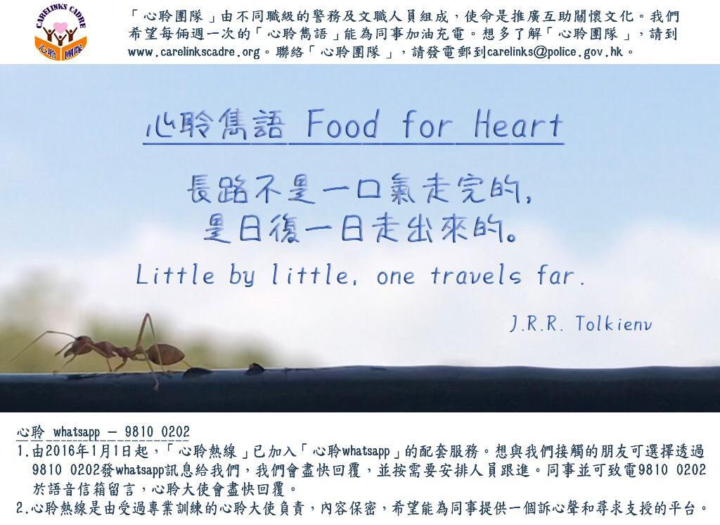 《心聆雋語》長路不是一口氣走完的,是日復一日走出來的。 2026 年 03 月 22 日2026 年 04 月 22 日 長路不是一口氣走完的,是日復一日走出來的。Little by little, one travels far.J.R.R. Tolkienv 分享此文: Share on X (Opens in new window) X Share on Facebook (Opens in new window) Facebook Like Loading...