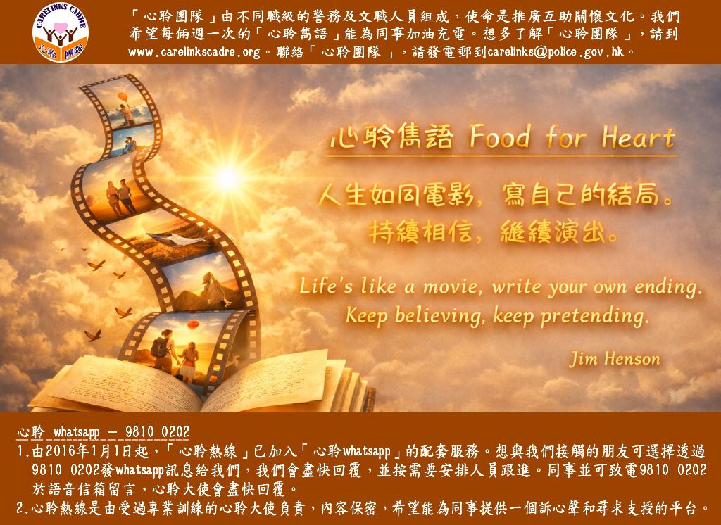 《心聆雋語》人生如同電影,寫自己的結局,持續相信,繼續演出。 2026 年 04 月 21 日2026 年 04 月 22 日 人生如同電影,寫自己的結局,持續相信,繼續演出。Life’s like a movie, write your own ending. Keep believing, keep pretending.Jim Henson 分享此文: Share on X (Opens in new window) X Share on Facebook (Opens in new window) Facebook Like Loading...